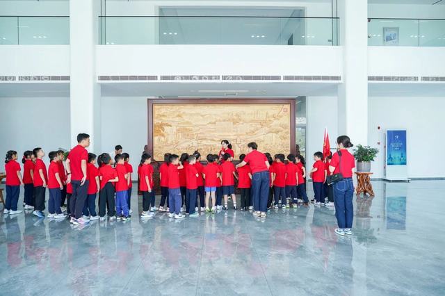 首先,今飞凯达副总经理兼董事会秘书葛茜芸带领孩子们来到了办公楼大厅木雕屏风前,做了屏风介绍:这座屏风记载了今飞发展史,它以今飞《飞翔之歌》为主线,以今飞重要历史瞬间,贯穿全屏,诉说了今飞坚守实体制造业66年艰苦创业、奋力拼搏的励志故事。这座屏风把老一辈今飞人艰苦创业,始终秉承实业强国的精神,创造一个又一个奇迹的故事篆刻得栩栩如生,也把新一代今飞人接力前行,跟随社会发展的脚步,经过改制以后二十多年的跨越式发展刻画得淋漓尽致。看着这座屏风上的每一个人物雕刻,听着葛总的娓娓道来,孩子们若有所思,深受震撼,觉得今飞的创业者很不容易,很了不起,纷纷为他们的坚守点赞。